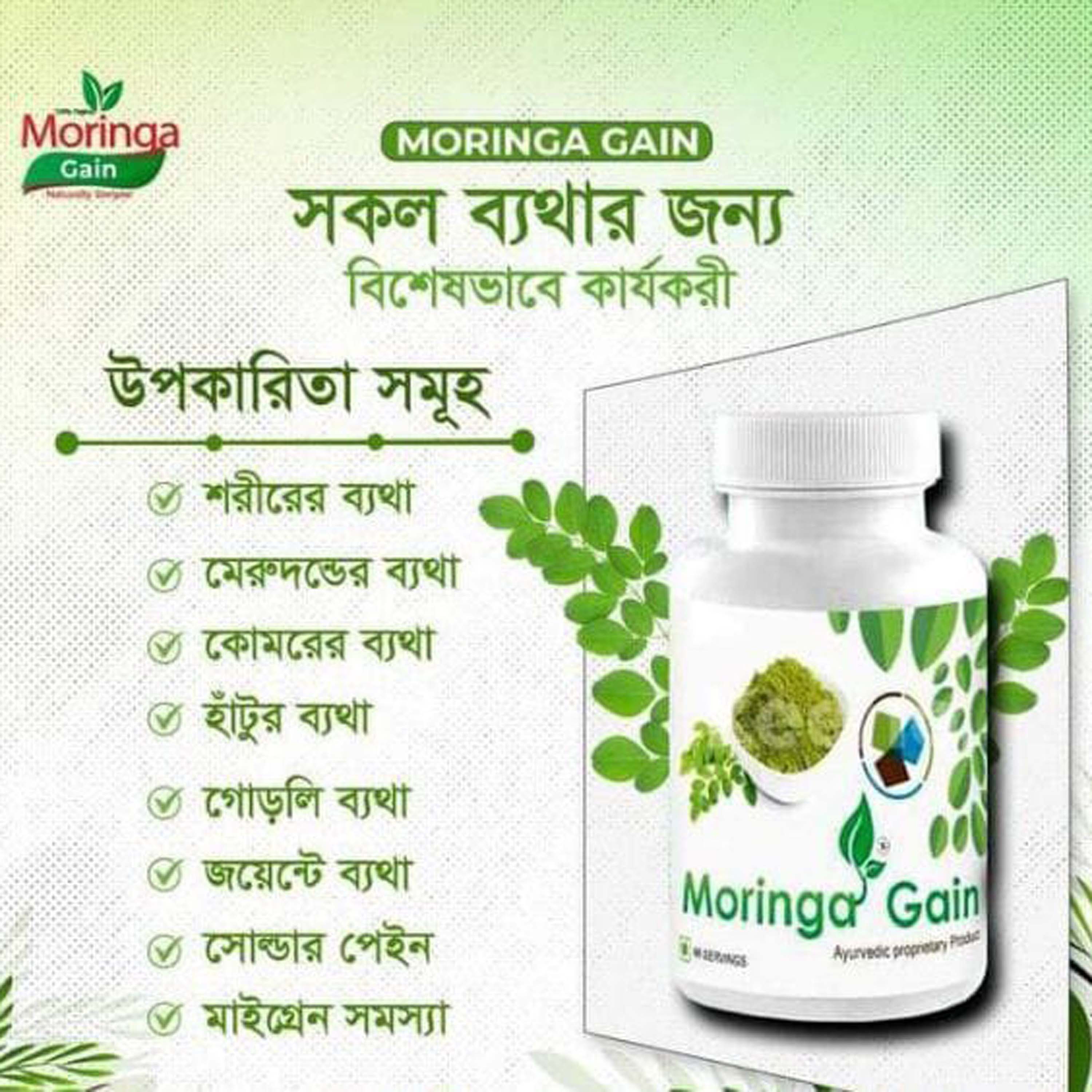 কি কি সমস্যার জন্য মরিঙ্গা গেইন টেবলেট সেবন করবেন ? ব্যাকপেইন (কোমর ব্যথা)। শরীরে যেকোনো জয়েন্টের ব্যথা। মাংস পেশীর ব্যথা কাঁধে ও ঘাড়ে ব্যথা। পিঠে ব্যাথা। দুর্ঘটনাজনিত ব্যথা আর্থ্রাইটিস বা বাতের এর ব্যথা। গেটে বাত বা গাউট এর ব্যথা। দাঁড়িয়ে থাকার ফলে পায়ের পাতা/গোড়ালিতে ব্যথা। হাড় ক্ষয় জনিত ব্যথা। পায়ের ঝিন ঝিন ভাব দূর করে সর্দি, কাশি (বুকে ও মাথায় ব্যবহার করবেন)বা র্ধ ক্য জনিত দুর্ব_লতা রোধ করে।ডায়াবেটিস এর দূর্ব_লতা দূর করে।রক্ত স্বল্পতা হিমোগ্লোবিনের অভাব দূর করে।কোষ্টকাঠিন্য (কষা) সমস্যা দূর করে।মাইগ্রেন (মাথা) ব্যথা বা ঘুমের সমস্যা দূর করে।দৃষ্টি স্বল্পতা চোখে কম দেখা রোধ করে।শরীরে রোগ প্রতিরোধ ক্ষমতার উন্নয়ন ঘটায়।হজম দূর্বলতা আমাশয় সমস্যা দুর হয়।প্রস্রাবের ইনফেকশন দূর করে।ভিটামিন আয়রন ক্যালসিয়াম এর অভাব পূরণ করে।অস্টিওপোরোসিস বা হাড়ের ক্ষয় রোগ রোধ করে।রিউমেটিক ফিভার বা বাত জ্বর ভালো করে।জয়েন্টের ব্যথা ভাল হয়।পাইলস ও অর্শ রোগ কার্যকারী।অনিয়মিত ঋতুস্রাব নিয়মিত করে।চলুন জেনে নেই মরিঙ্গ গেইন যে ১০ টা উপাদান দিয়ে তৈরি । মরিঙ্গা অলিফেরা।অরিগানো ভালগারো একোয়া।রোজমেরি নির্যাস।পার্শিয়া ও বেদানার জলীয় নির্যাস।শিলাজিৎ জলীয় নির্যাস ।উচ্চতর সম্পন্ন মেথির জলীয় নির্যাস।পিরুলিনা নিলাব সবুজ শৈবাল।আমলা ও স্পিরুলিনার জলীয় নির্যাস ।কারকিউ( হলুদ ) এর জলীয় নির্যাস।পিপার নিগ্রাম এর জলীয় নির্যাস এটি উচ্চ ক্ষমতা সম্পন্ন ভিটামিন এর উৎস।মরিঙ্গা গেইন সেবনবিধিঃসেবনবিধিঃডক্টর কেরেন ভিয়েরা এর নির্দেশনা অনুযায়ী, প্রতিদিন দুটি মরিঙ্গা গেইন সেবন করতে হবে। অর্থাৎ সকালবেলা একটি এবং রাত্রে ঘুমাতে যাওয়ার আগে একটি মরিঙ্গ গেইন পানিসহ সেবন করতে হবে। এক্ষেত্রে ব্যক্তি ও প্রয়োজন বেধে সেবনের পরিমাণ কম বেশি হতে পারে।পার্শ্ব প্রতিক্রিয়াঃউল্লেখ্য যে, দীর্ঘ সময় কাল ধরে মরিঙ্গ গেইন সেবন করার ফলে কোন প্রকার পার্শ্ব প্রতিক্রিয়া পরিলক্ষিত হয়নি।