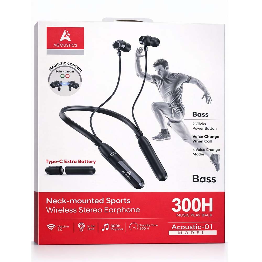 Acoustic-01 Neck-mounted Sports Wireless Earphone একটি প্রিমিয়াম কোয়ালিটির ব্লুটুথ নেকব্যান্ড ইয়ারফোন, যা স্পোর্টস ও দৈনন্দিন ব্যবহারের জন্য ডিজাইন করা হয়েছে। এতে রয়েছে শক্তিশালী Bass সাউন্ড, Magnetic Control সিস্টেম (Auto On/Off), Type-C চার্জিং সুবিধা এবং দীর্ঘ সময়ের ব্যাটারি ব্যাকআপ।