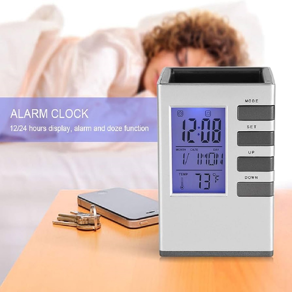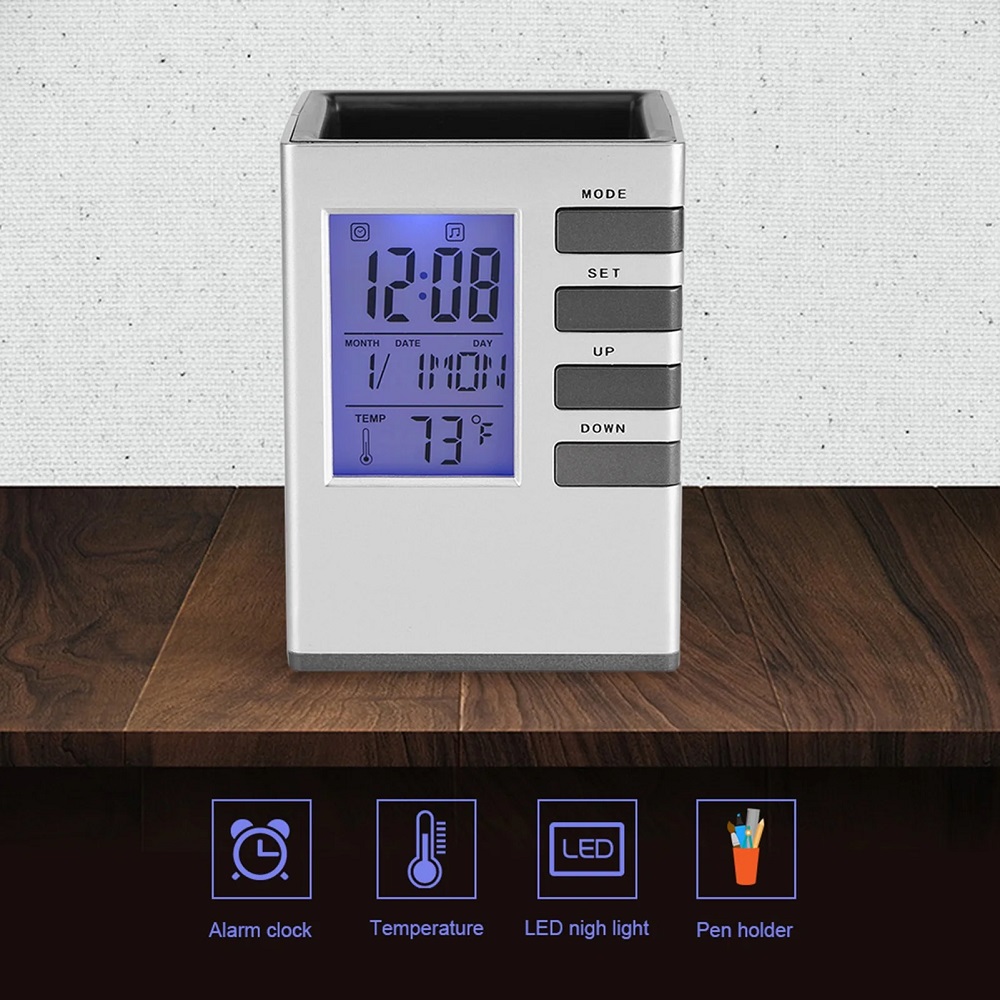 Desk Organizer Table Clock Digital Pen Holder Alarm Clock Multipurpose